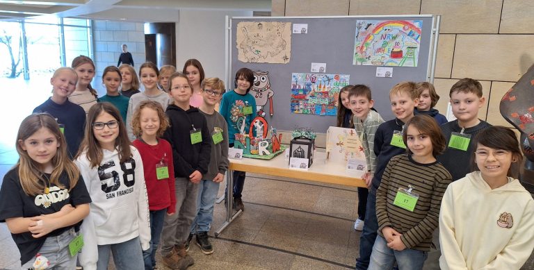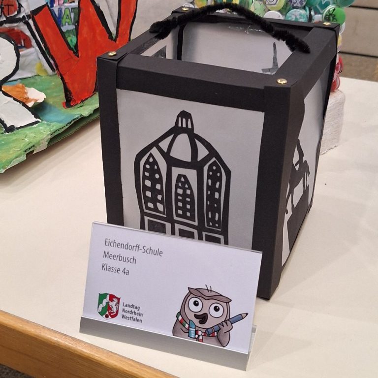 Am 02. März machte sich die Klasse 4a und Lenny aus der Parallelklasse auf den Weg in den Landtag NRW. Die Klasse wurde eingeladen, da sie zu den 25 ausgewählten Bastel- und Malarbeiten des Wettbewerbs "80 Jahre NRW" zählte. Die Laterne, die das Meerbuscher Teehäuschen, die Reiterstatue von Jan Wellem, das NRW-Wappen und die Skyline von Düsseldorf zeigt, wurde dort im Foyer ausgestellt.